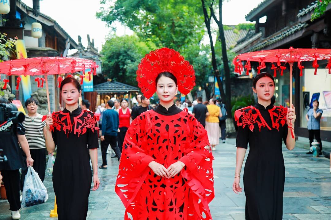 除了燃面,本场推介会上还有很多非遗元素。独具川南韵味的文化走秀上,模特身穿或手持宜宾横江剪纸、泸州分水油纸伞两个国家级非物质文化遗产代表性项目,与现场观众进行“零距离”互动。