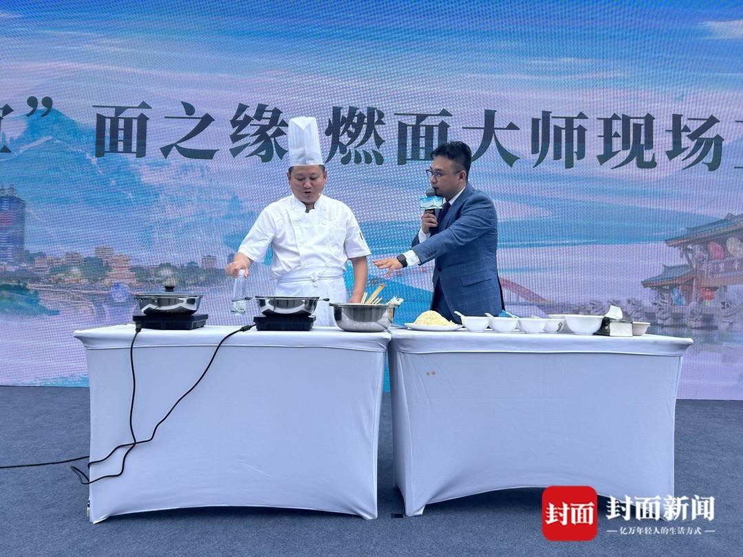 燃面作为宜宾特色美食,其传统制作技艺在2011年被列入四川省省级非物质文化遗产名录。推介会现场,成都市民走上舞台,亲自尝试制作一碗宜宾燃面。台上指导市民的是来自宜宾的中国烹饪大师刘兴高,他向成都市民发出邀请:欢迎来宜宾品尝各种口味的地道燃面。